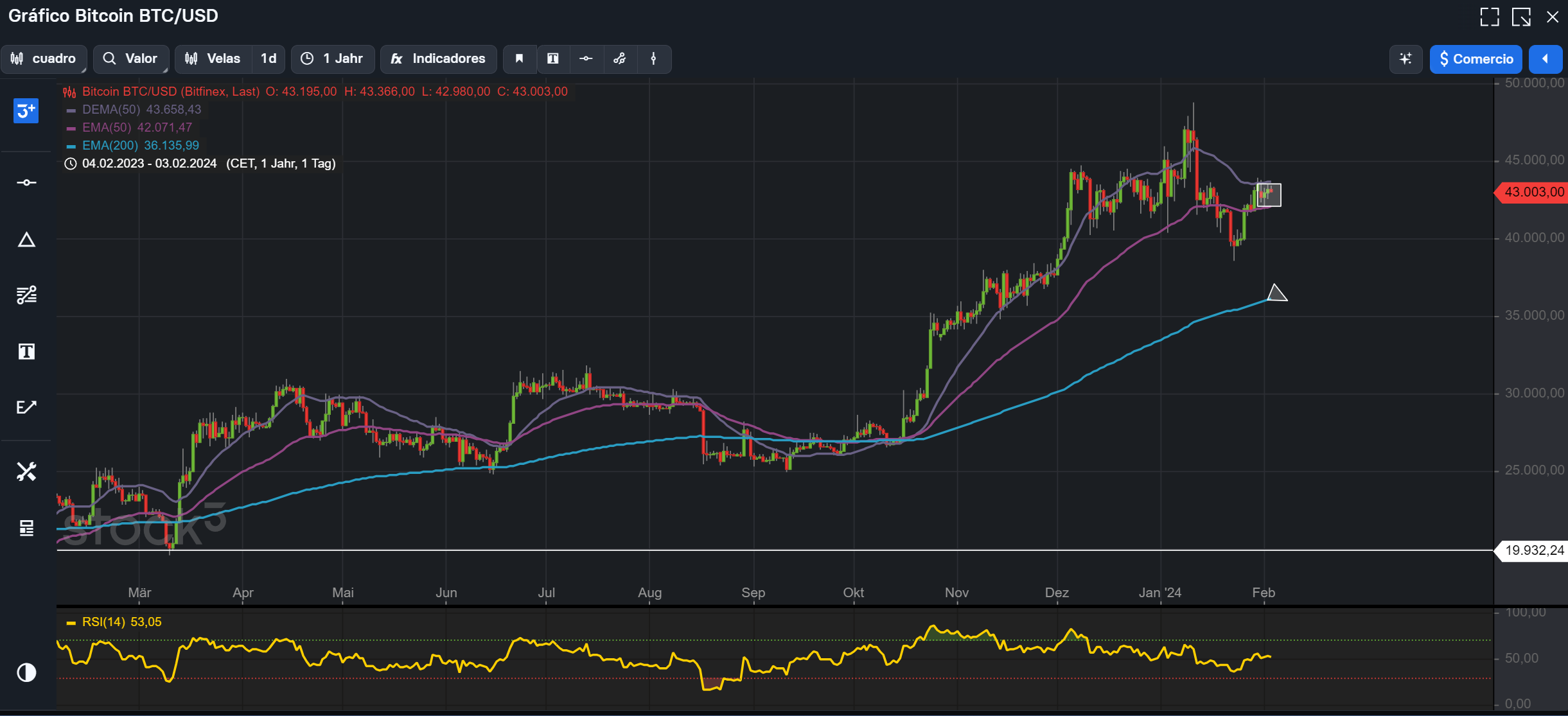 En el se pude ver (cuadrito), como estamos en esa tendencía de estar en precios entre los 42.000 y 43.000$, destaco también Ema 200, pues es la tendencia principial alcista que sube día a día, ahora está en 36.135$, en teoría no debiera vulnerarse para continuar, Ema y Dema 50 aunque han disminuido considerablemente su apertura, no da cambios en la tendencia alcista.