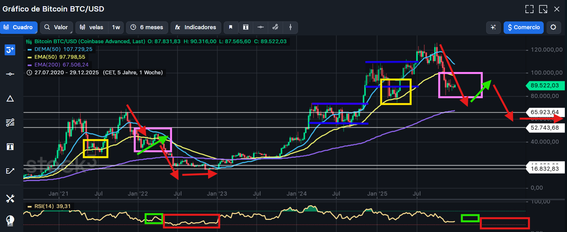 En mi gráfico EMA 200 esta marcando 103.392$, hace ya casi un mes que se partió con contundencia, teniendo en cuenta que ahora estamos 13.000$ por debajo de Ema 200, ya no hay nada que defender.Buen reinicio. Mirar el panorama general ayuda mucho aquí.