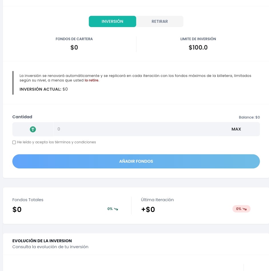 Se explica el uso. Dentro de la aplicación solo hay dos botones, ingresar y retirar. Todo el dinero que este ingresado se usará para la IA hasta el máximo de tu Tier. Está restringido a 100$ ahora mismo, si va bien el aplicativo se sube a 1000$, y luego el máximo del Tier de cada usuario.