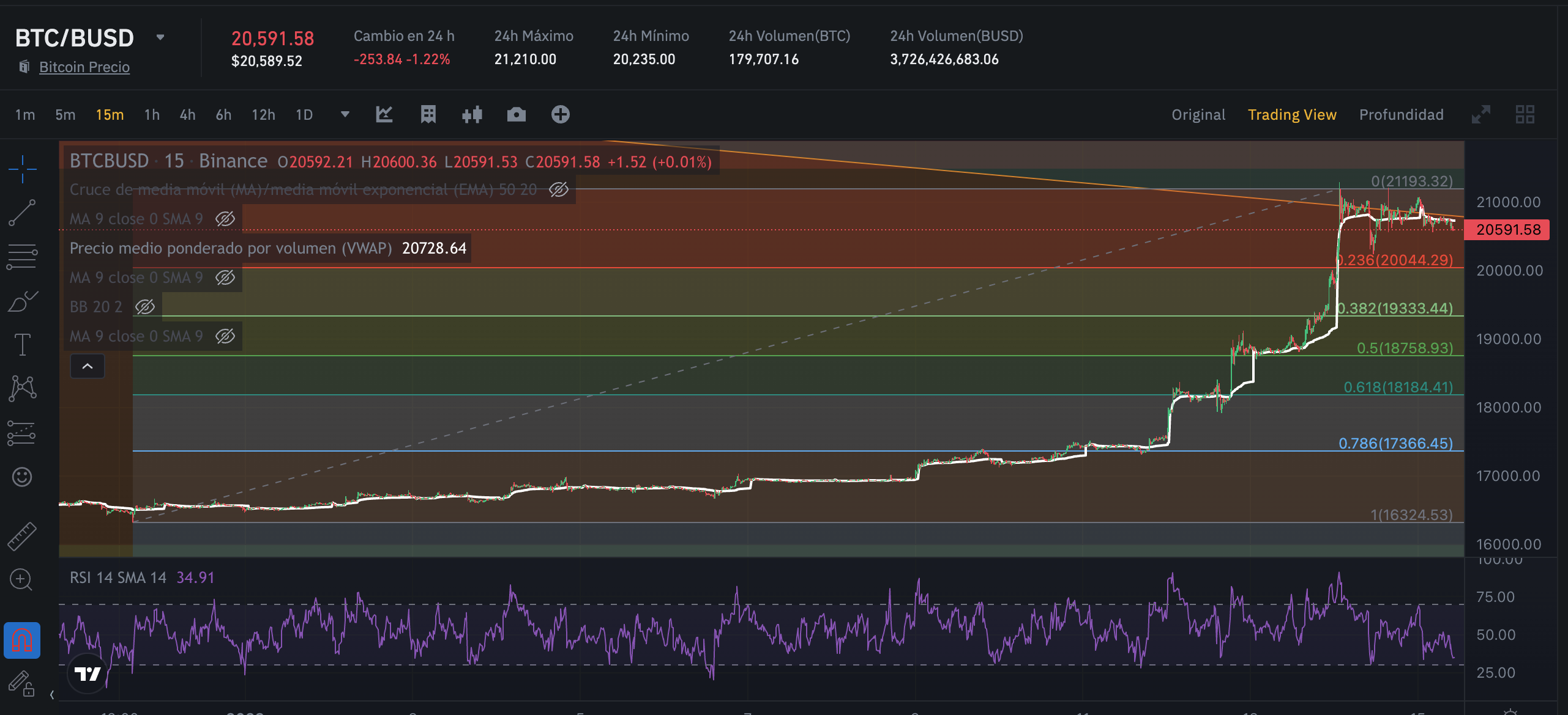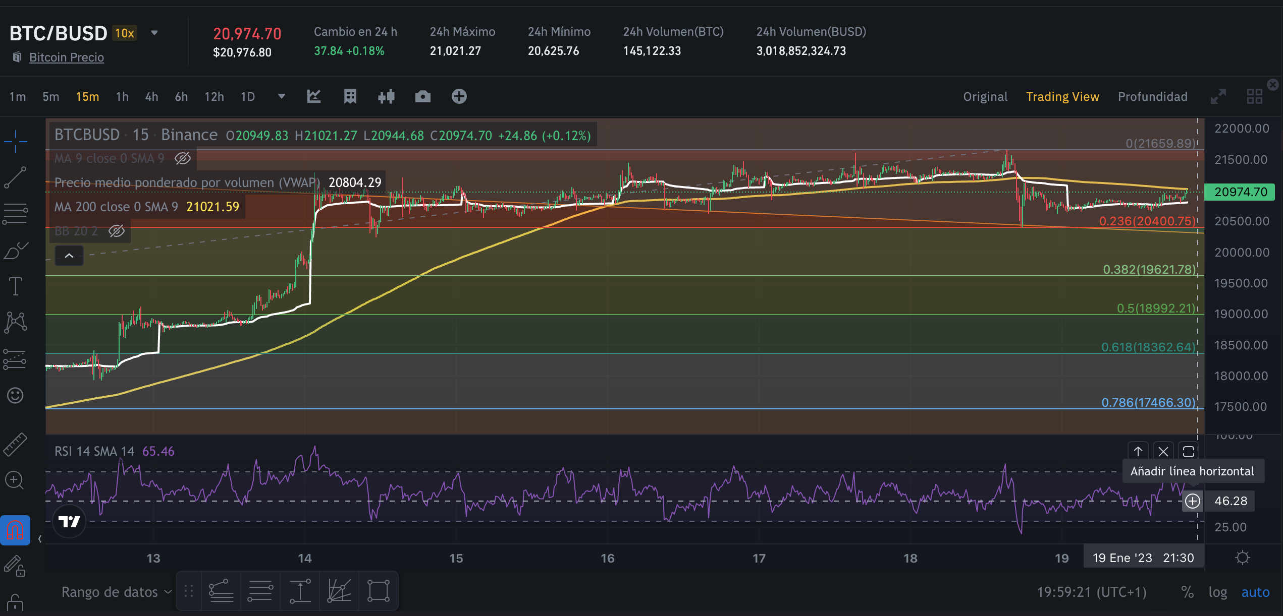 Mirando el retroceso Fibo, veo el nivel de 20.044 a observar, puesto que si perdemos ese nivel creo que nos vamos para abajo casi seguro, buscando recomprar un poco en 18.184 y más en 17.366. Si desde esos niveles no rebota ya me espero a 16k, y el resto de liquidez para 13.900