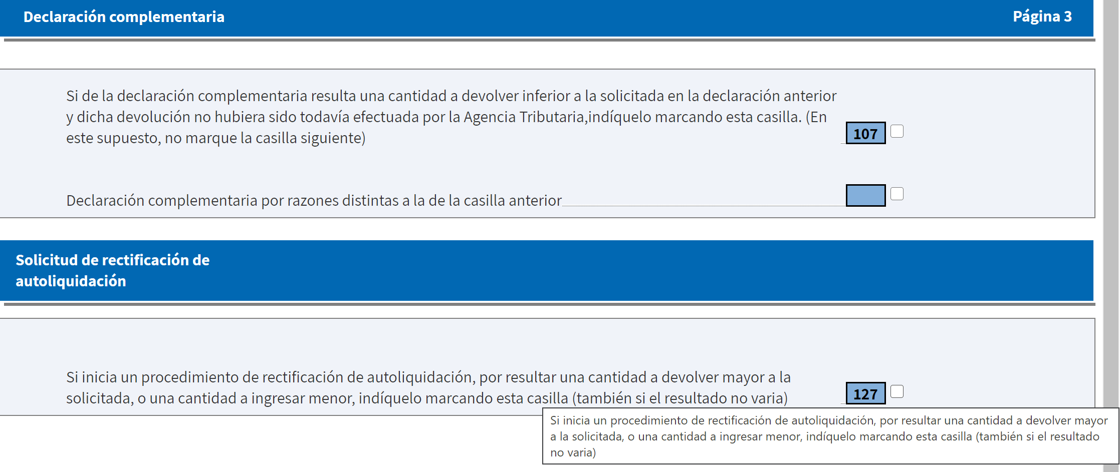 - Modificaciones que alteran el resultado de la autoliquidación a favor de Hacienda (menos devolución o más pago). En este caso, habría que presentar una complementaria. Se procedería igual que para el caso anterior, pero seleccionando la opción 107 en lugar de la 127.