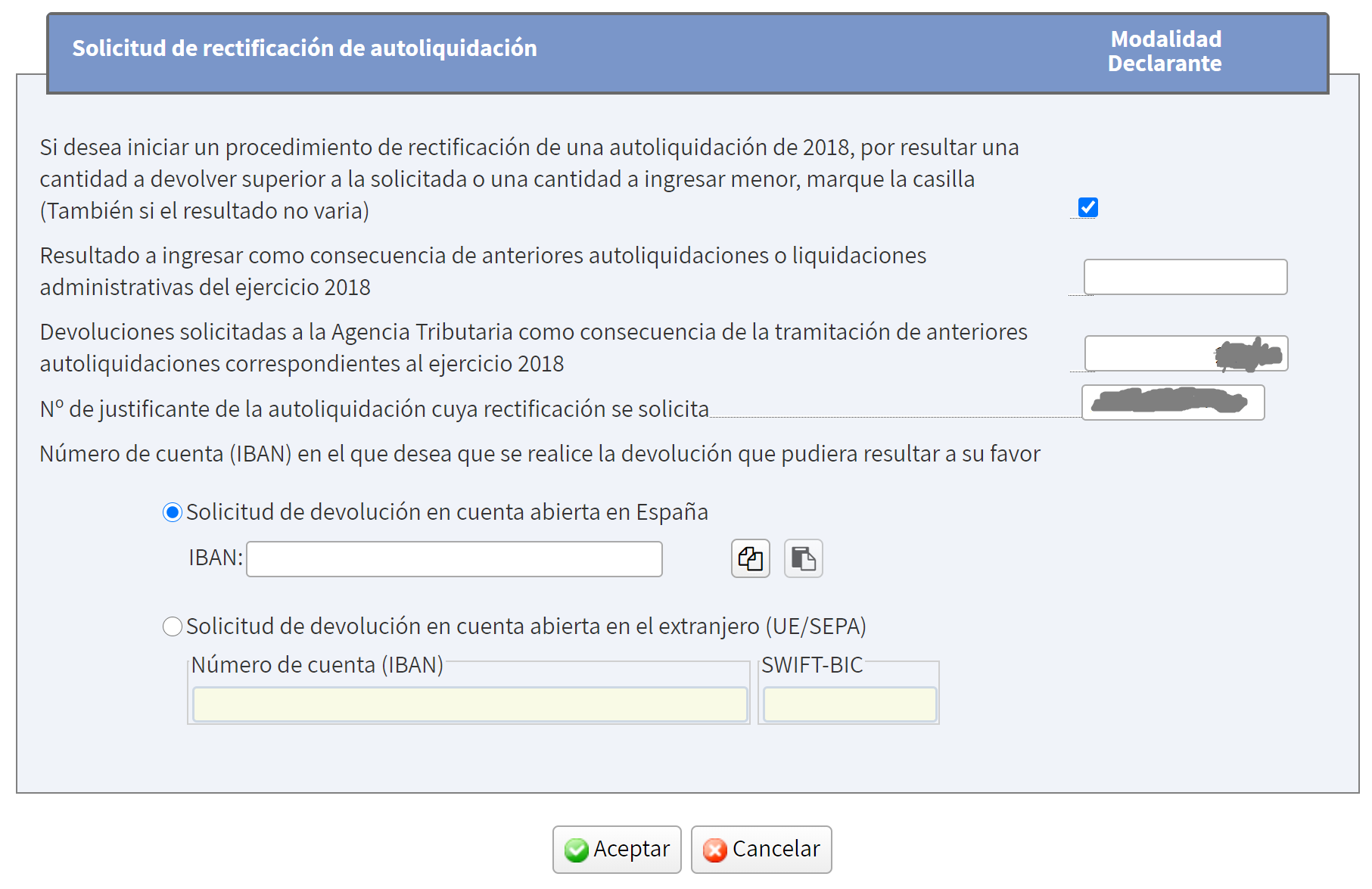 Una vez que la seleccionemos, nos aparecerá una ventana en la que deberemos hacer “tick” en la primera opción que nos aparece y, automáticamente, se nos cargarán en las casillas de abajo el resultado que teníamos de nuestra declaración anterior. Debemos indicar también el IBAN de nuestra cuenta bancaria y le damos a Aceptar.